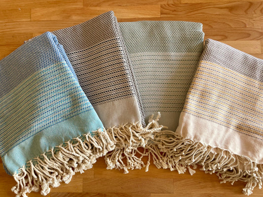 Here’s where the towel idea comes from—2 summers ago we stayed by the Aegean in a cute little house with 5 towels total for 3 people. I swam 3 times a day and they swam at least twice. Turkish towels, called pestemels, are so lightweight my towel would dry completely while I was swimming. Also doubled as a skirt while trekking the 10 flights of stairs back to our cute little cabin.